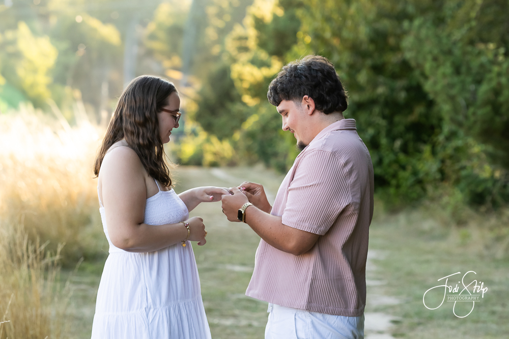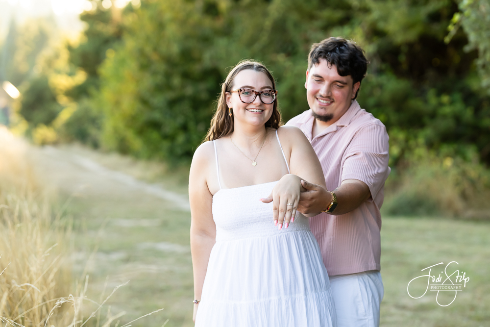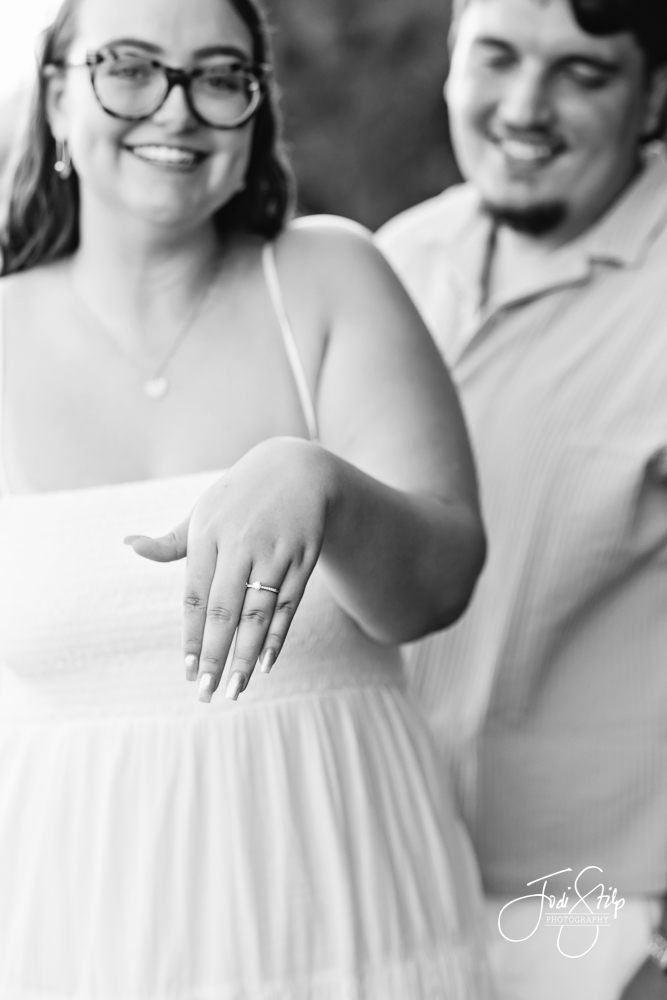 He took Grace back to the spot of their first date (so sweet) and we started walking up the trail to find a secluded area. It was BEASTLY hot and a little humid. They were such troopers to go through with a photo session in such hot conditions. We found a good spot and I posed them for a few shots, including one where they were back to back. I asked Camden to “step out of the frame” (WINK WINK) so I could grab a couple snaps of just Grace. While I was photographing her he set up behind her. When she turned around, there he was… on one knee with a ring and a proposal of marriage. She said YES and we spent the rest of the session showcasing their love and her pretty ring.