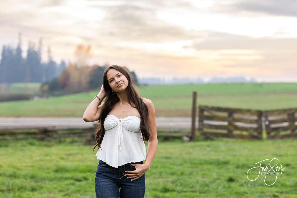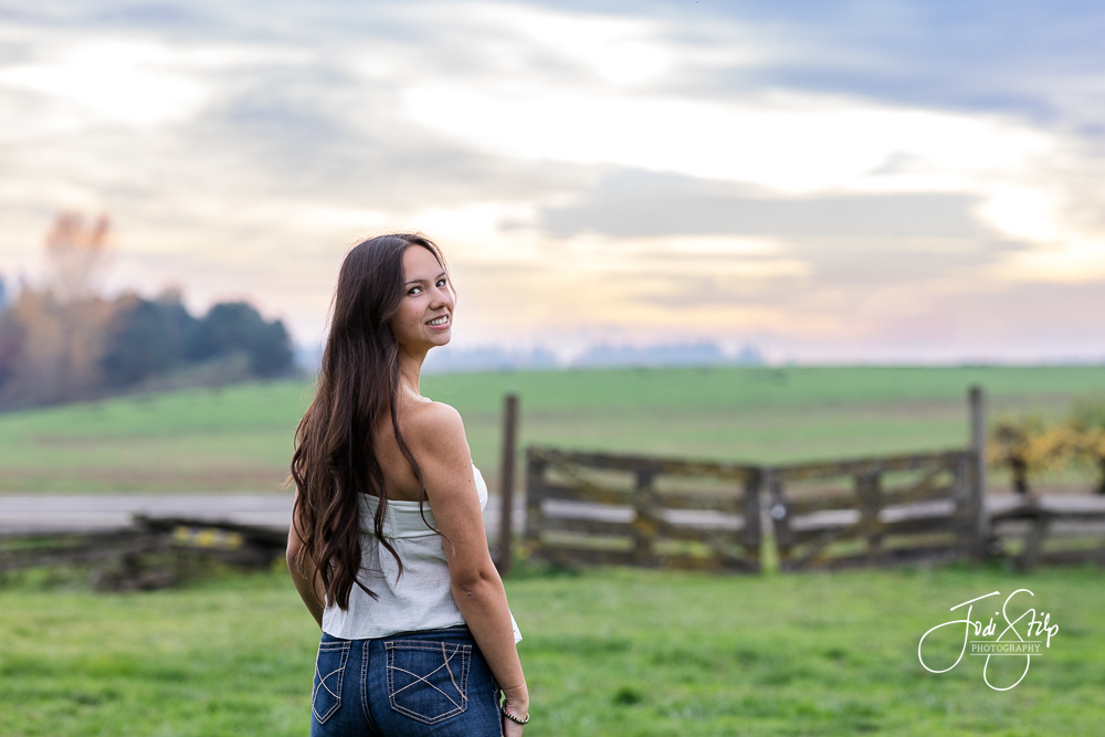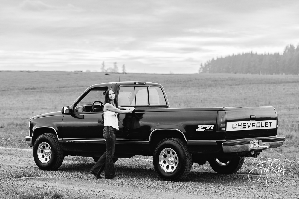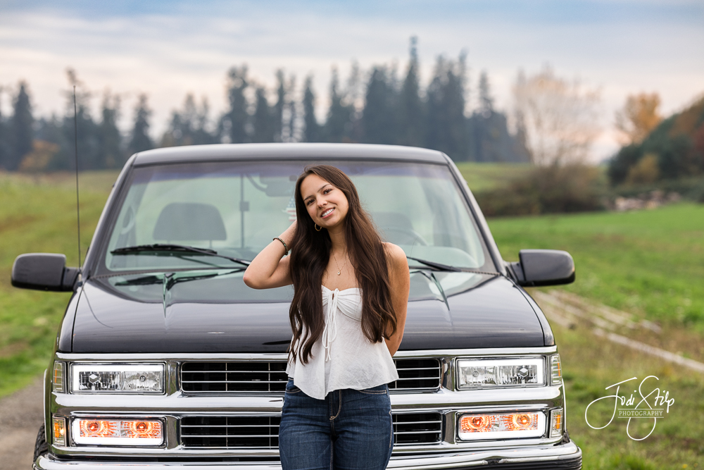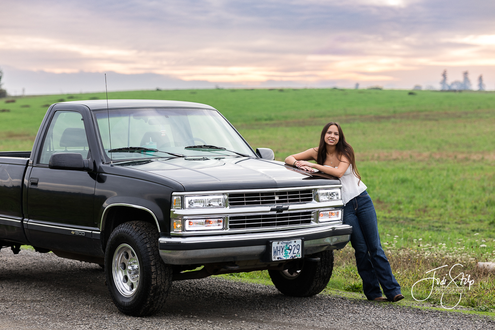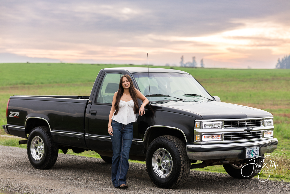 Taryn is a Class of 2026 senior at Newberg High School.  We had a beautiful night for her senior photos – the sky popped off – and her truck was so shiny and clean.  She wanted authentic photos and I think we nailed it. Thanks Taryn for coming with clear ideas of what you wanted to creating and working with me to do just that.  I loved meeting you.  Have a fantastic senior year!